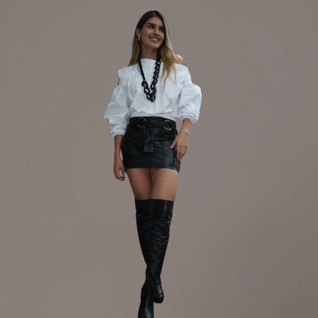 La combinación perfecta entre elegancia y rebeldía. Su diseño corto estiliza tu figura y te da ese toque de seguridad irresistible.